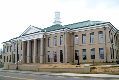 Logan County Court of Justice, a brown stone two story building with a green roof, the entrance features four large columns.