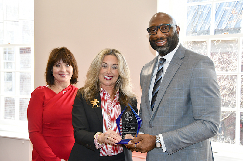 Jefferson Family Court Chief Judge Derwin L. Webb (right) poses with Justice Angela McCormick Bisig (middle) and Chief Justice Debra Hembree Lambert after receiving the William E. McAnulty Jr. Award on Feb. 11 at the University of Louisville Louis D. Brandeis School of Law. Judge Webb, who was a mentee of Justice McAnulty, was honored for his mentorship of Jefferson County Public Schools students. (Photo by Jim Hoffmann, Administrative Office of the Courts)